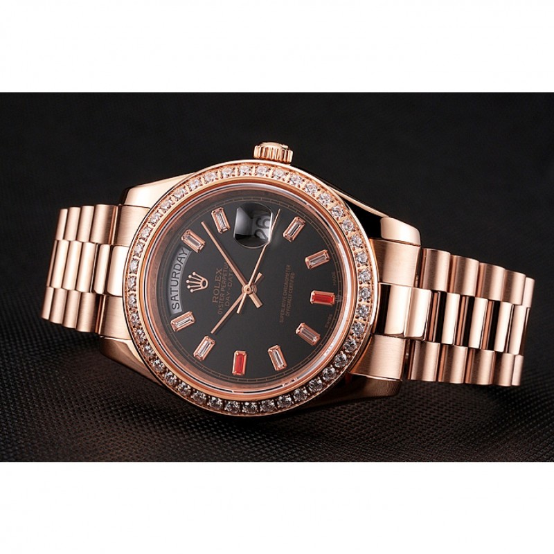 Die Swiss Rolex Day-Date Diamonds And Rubies mit schwarzem Zifferblatt und roségoldem Armband (Modellnummer 1454102) ist nicht nur eine Uhr, sondern ein echtes Statussymbol für den stilbewussten Mann. Diese exquisite Replik zeigt die Meisterschaft Schweizer Uhrenkunst und kombiniert klassische Eleganz mit einem Hauch von Luxus. Mit einem Kinetik- (automatischen) Uhrwerk der renommierten Swiss ETA ist diese Uhr genau das, was Sie brauchen, um sowohl im Alltag als auch zu besonderen Anlässen aufzufallen. Die 50 x 41 mm große Gehäusedicke von 13 mm sorgt dafür, dass die Uhr sowohl im Alltag als auch bei formellen Veranstaltungen hervorragende Dienste leistet.
